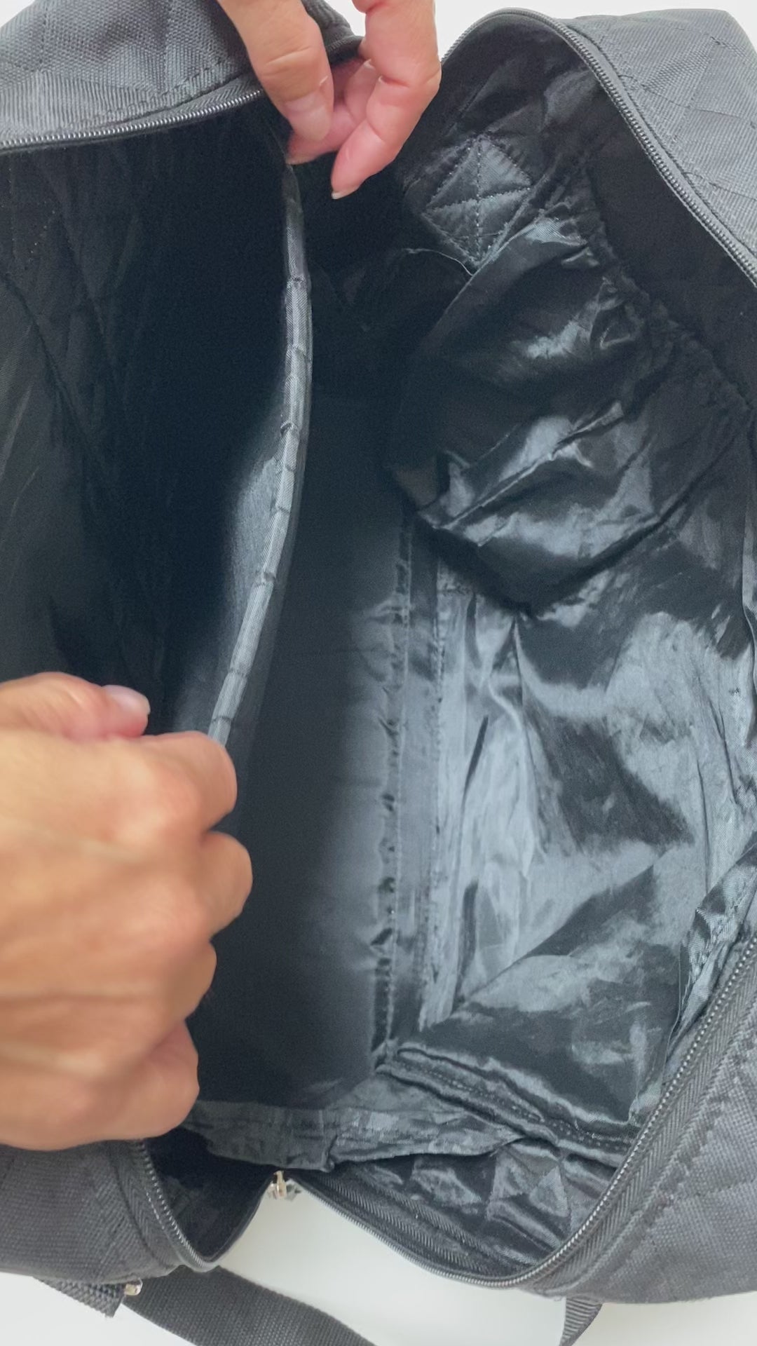 The diaper bag has a quilted look and leather handle. The adjustable strap that comes with it makes it possible to hang it on the pram or carry it over the shoulder.